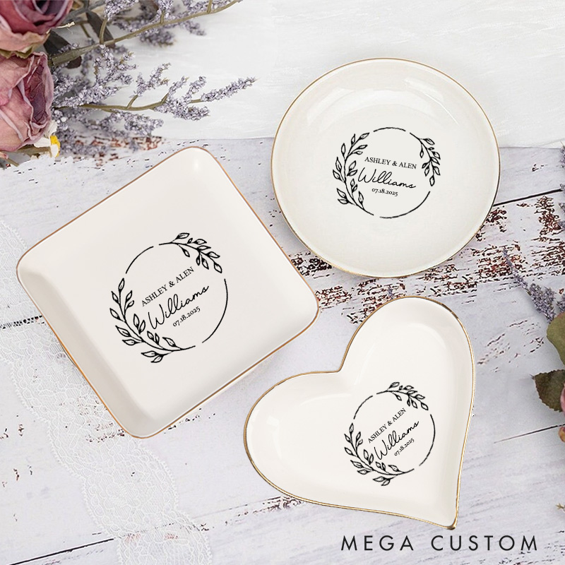 Personalized Delicate Botanical Wreath Wedding Monogram Wedding Engagement Gold-Trimmed Ring Dishes