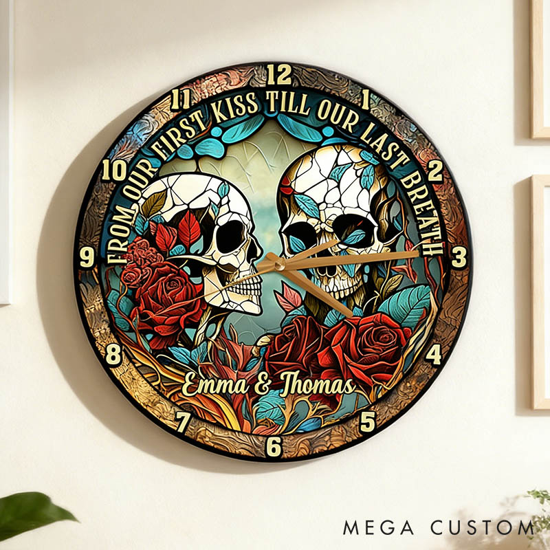 Personalized Skeleton Couple From Our First Kiss Till Our Last Breath Wall Clock Custom Retro Gothic Graphic 3D Printed Wall Clock Valentines Day Gift
