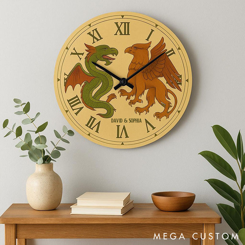 Personalized Vintage Wall Clock Mythical Creatures Dragon and Griffin Design Wall Clock Gothic Fantasy Cottagecore Wall Art Gift for Husband Wife