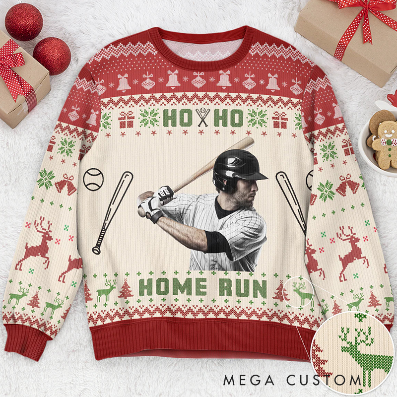 Personalized Baseball Ho Ho Home Run Ugly Sweatshirt with Custom Photo