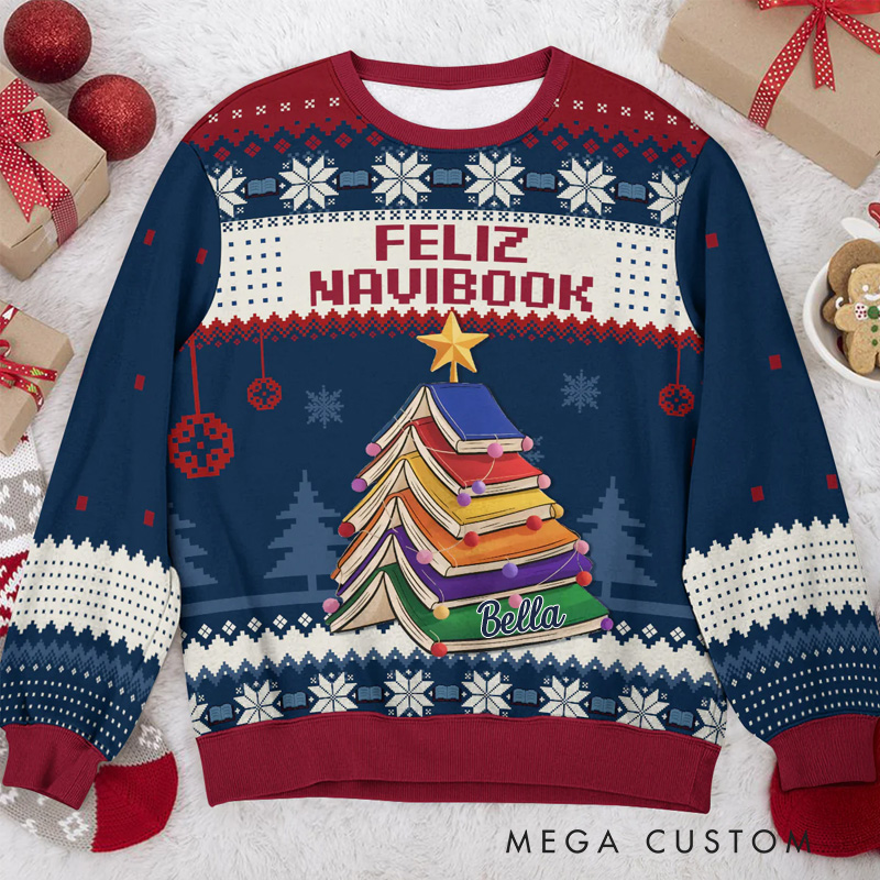 Personalized Feliz Navibook Merry Bookmas Ugly Sweater Christmas Gift Ugly Sweater for Book Lovers Reader Bookworm Bookish Librarian