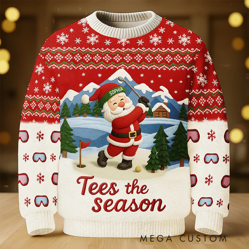 Personalized "Tees the Season" Golf Christmas Ugly Sweatshirt with Santa and Custom Name for Golf Enthusiasts