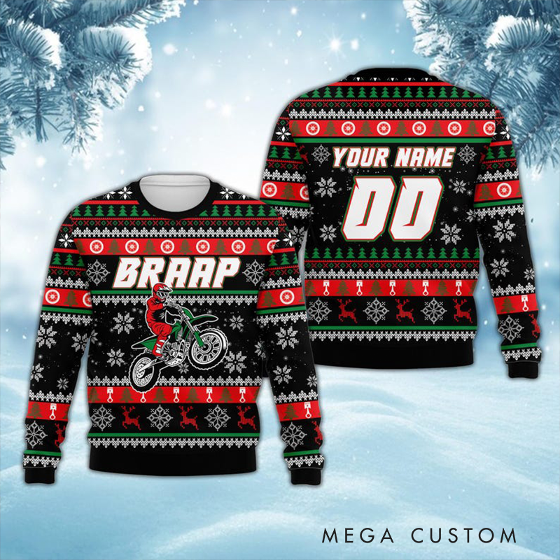 Personalized Dirt Bike Christmas Sweater Custom Name and Number Motocross Ugly Holiday Jumper Gift for Racing Lovers and Riders