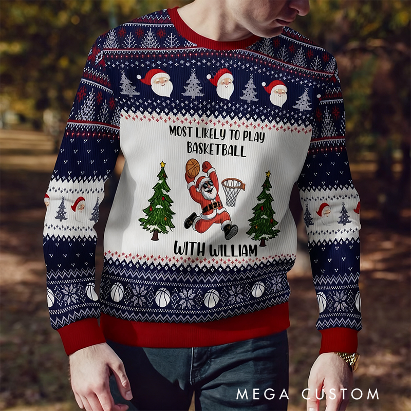 Personalized Basketball Christmas Sweater with Santa Design and Custom Name