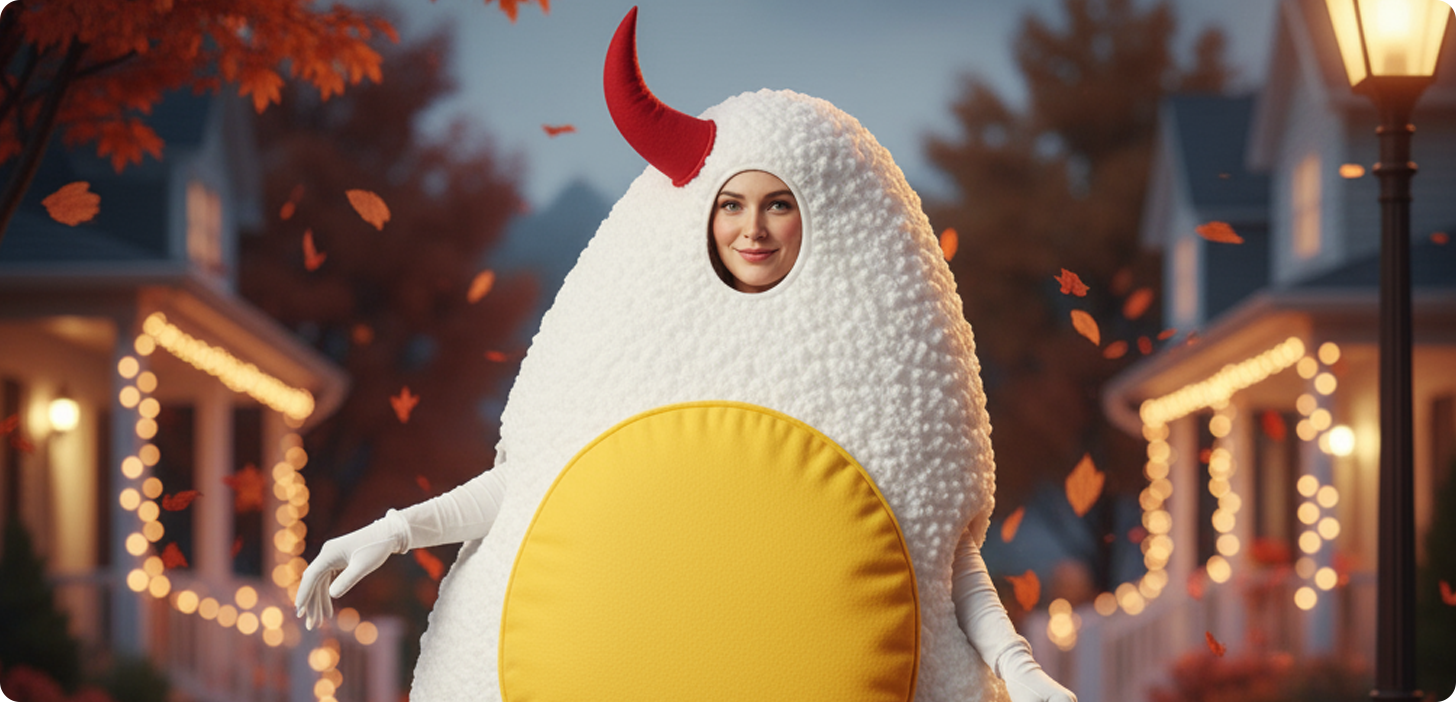 - Deviled Egg: Wear all white. Attach a large, cut-out red felt devil horn and tail to a yellow circle (the yolk) pinned to your front or back.