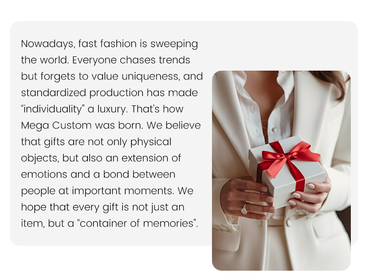 At Mega Custom, our team is our greatest asset. We are proud to have a group of talented designers whose artistic skills and boundless creativity set us apart. Our designers excel at transforming ideas into stunning visuals, ensuring that every custom piece is both unique and meaningful. Their expertise and passion drive our mission to create gifts that capture the essence of personal stories and emotions. With a commitment to innovation and excellence, our team continuously pushes the boundaries of design, bringing fresh and inspiring concepts to life for our clients.