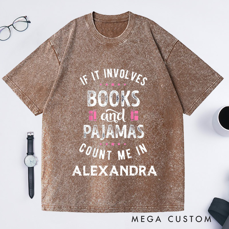 The design is themed around "IF IT INVOLVES BOOKS AND PAJAMAS, COUNT ME IN" and features vibrant and fun white and pink fonts. The text is interspersed with pink books and star patterns, adding a warm and casual atmosphere. The overall design is simple and full of personality, which is very suitable for people who love reading and enjoy comfortable home time.