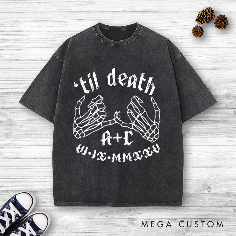 This bold and edgy design features intertwined skeleton hands with the phrase "'Til Death," creating a striking and symbolic aesthetic. Perfect for couples who love alternative or gothic styles, it’s ideal for weddings, anniversaries, or unique keepsakes that celebrate eternal love.