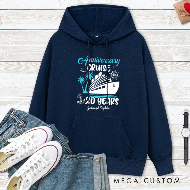 Celebrate 20 years of love with these stylish anniversary cruise hoodies! Featuring a nautical cruise ship design, tropical accents, and personalized names (e.g., "James & Sophia"), these hoodies are perfect for marking your special milestone in comfort and style during your cruise adventure.