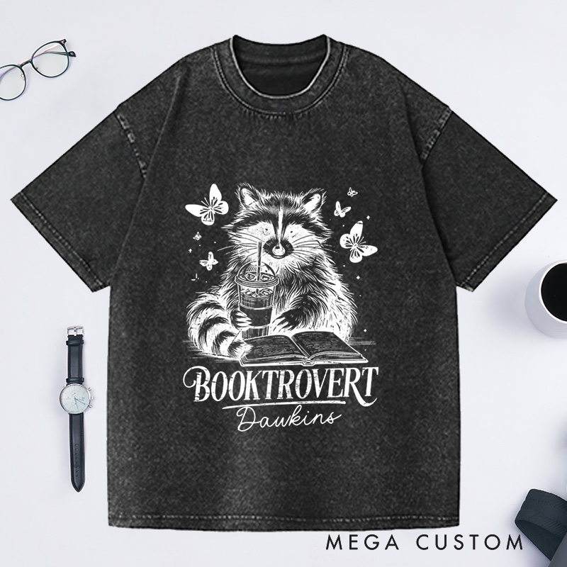 The design tshirt with a detailed black illustration of a raccoon sipping a drink while reading a book. Surrounding the raccoon are fluttering butterflies, adding a whimsical touch. Below the image, the word "Booktrovert" is displayed in a bold, elegant font, highlighting a love for reading and introversion.