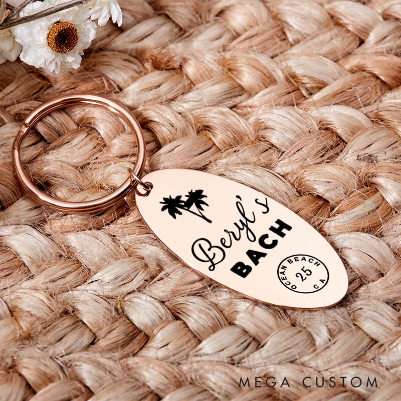 Celebrate your beachside wedding or bachelorette party with this stylish keychain! Featuring a fun palm tree design, "Name's Bach," and a Dewey Beach stamp, it’s perfect for bridesmaids, the bride, or mothers of the couple. A chic and practical keepsake to commemorate your special day by the sea!
