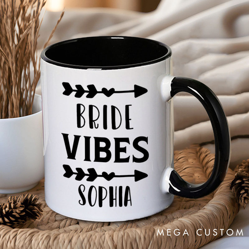 Spread the joy of your wedding with this trendy customizable mug! Featuring bold arrow and heart accents, along with space to personalize with a name, this mug is perfect for the bride or her bridal party. Its chic design and thoughtful personalization make it a stylish keepsake to capture all the "Bride Vibes" on your special day.