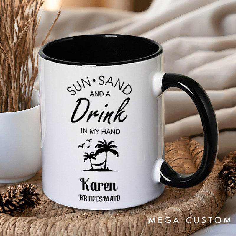 Bring tropical vibes to your wedding with this fun and customizable mug! Featuring the playful phrase "Sun, Sand, and a Drink in My Hand" with a charming beach design, this mug can be personalized with a name and title. Perfect for bridesmaids, the bride, or even the mothers of the bride and groom, it’s a unique and cheerful keepsake to celebrate your special day and the people who make it unforgettable.
