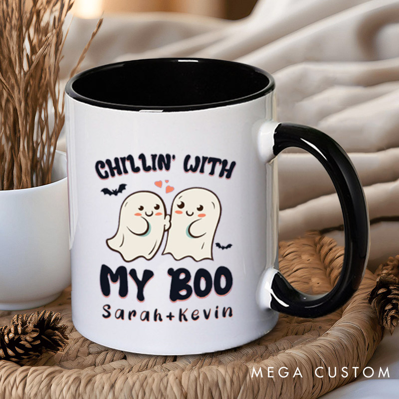 This adorable design features a pair of cute, blushing ghosts with hearts and bats, accompanied by the phrase "Chillin' with My Boo." Personalized with names, it's perfect for couples who want a sweet and playful Halloween-themed look.