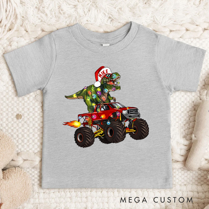 A dynamic illustration of a dinosaur in a Santa hat driving a monster truck. The vibrant colors and action-packed concept make it ideal for kids who enjoy adventurous and quirky designs.