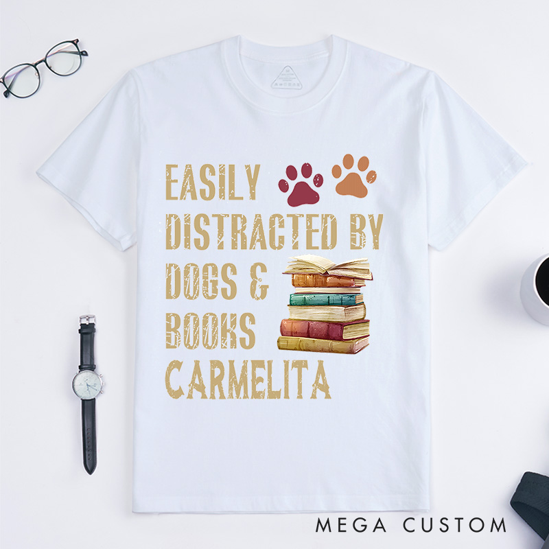 This design T-shirt with the phrase "Easily distracted by dogs & books" in bold, textured letters. It includes colorful illustrations of paw prints and a stack of books. The style is playful and relatable for dog and book lovers.