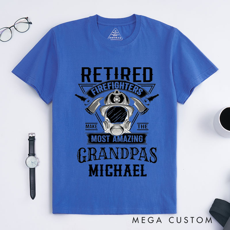 This charming design celebrates retired firefighters with the phrase "RETIRED FIREFIGHTERS MAKE THE MOST AMAZING GRANDPAS." It features an intricate illustration of a firefighter's helmet and mask, flanked by crossed axes, symbolizing their bravery and legacy.