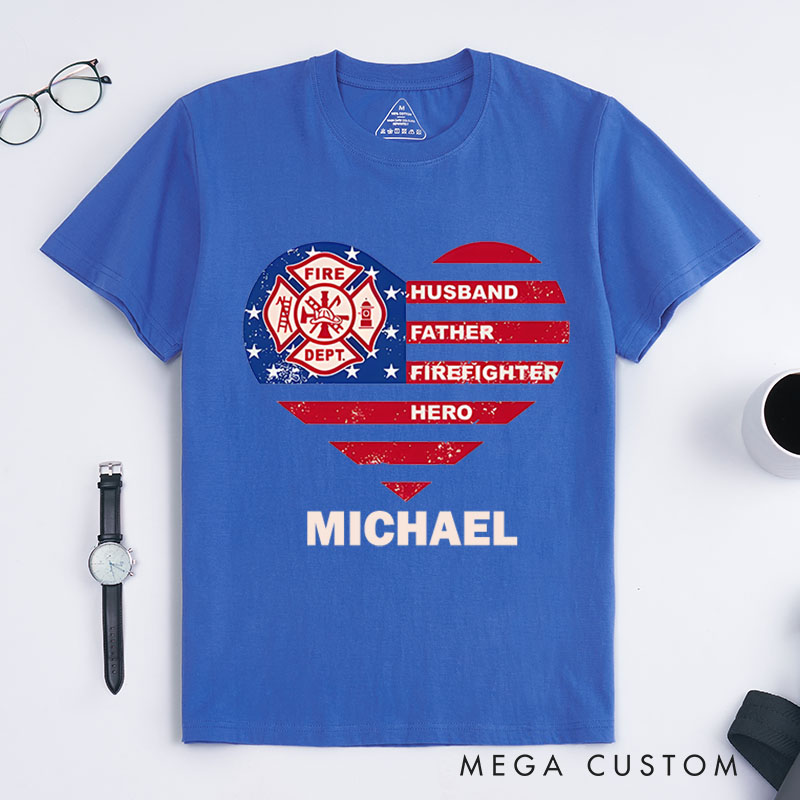 This design features a heart-shaped motif with an American flag pattern and a firefighter emblem, symbolizing dedication and patriotism. The words "HUSBAND," "FATHER," "FIREFIGHTER," and "HERO" are prominently displayed, celebrating multiple roles with pride.