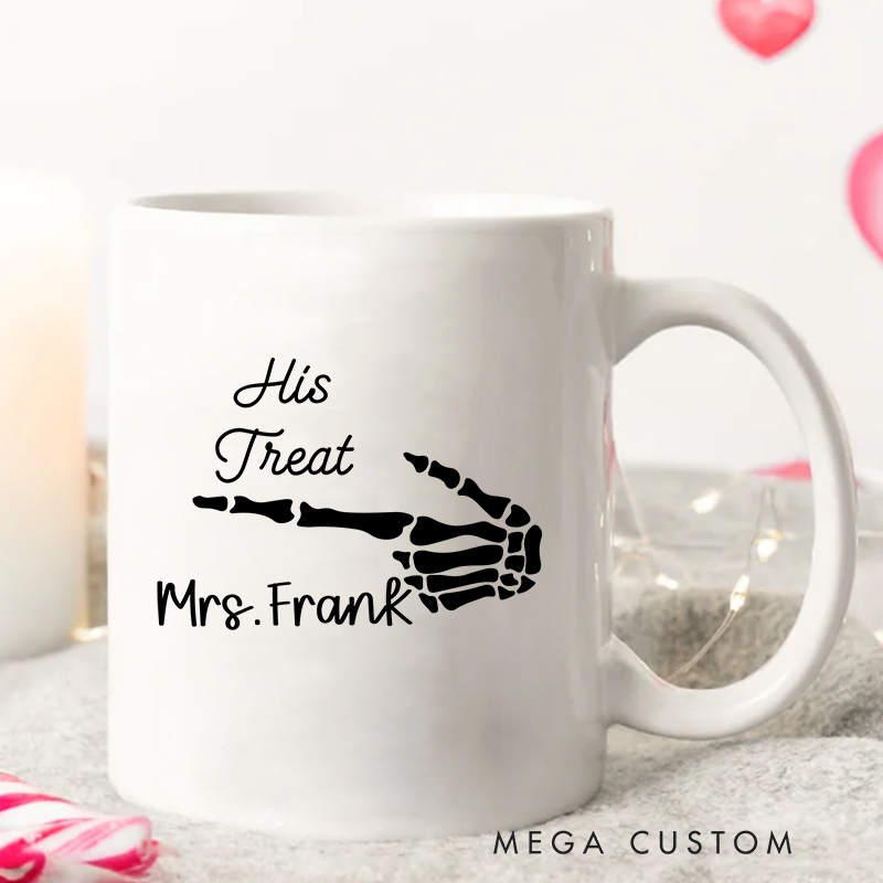 Celebrate love with a spooky twist! These Halloween-themed mugs feature "Her Trick," "His Treat," skeletal hands, and personalized names, perfect for festive couples.