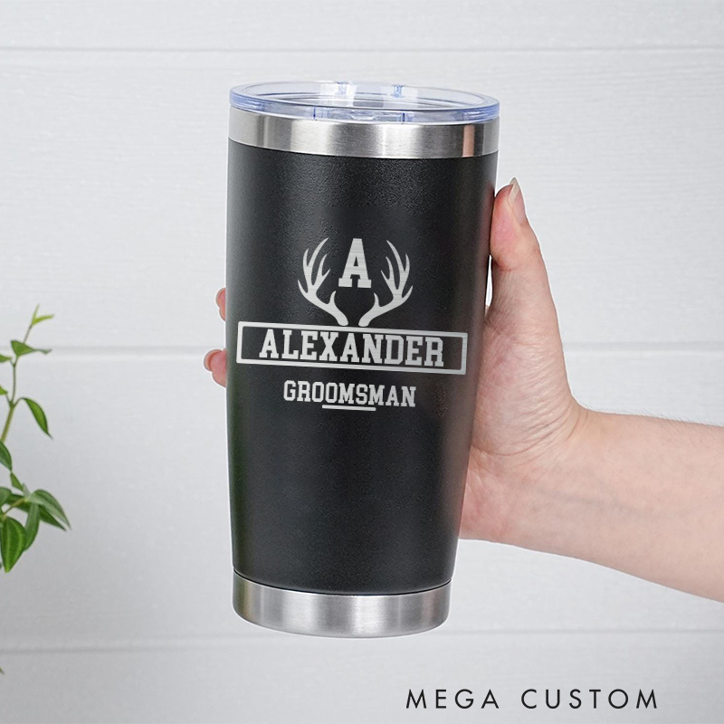 Celebrate your wedding party with these custom 20oz stainless steel tumblers. Featuring a rustic antler design, personalized names, and roles, these insulated tumblers keep drinks hot or cold for hours. Perfect for groomsmen, the best man, and the groom, these tumblers are a thoughtful gift for bachelor parties or wedding favors.