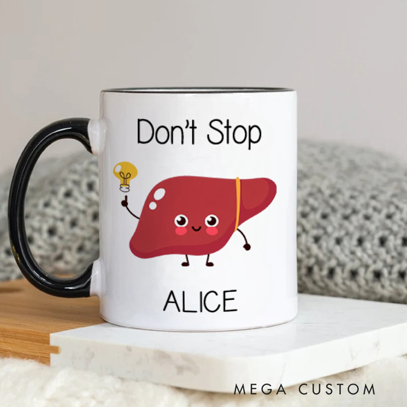 This mug design features a cute liver holding a lightbulb with the pun "Don't Stop BILI-vin'," referencing bilirubin. It’s a playful and uplifting design, perfect for liver health awareness or humor.
