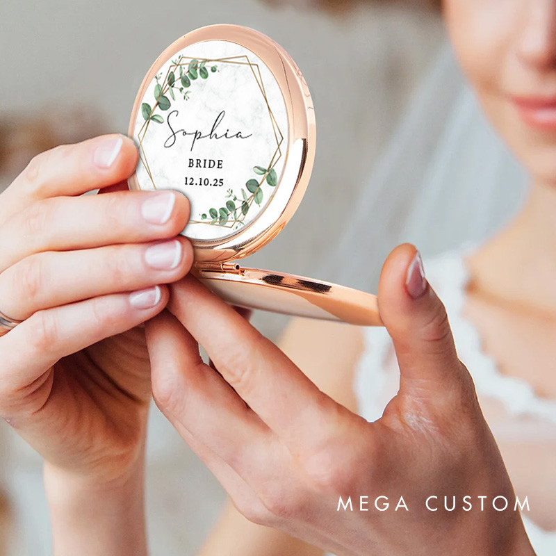Celebrate your wedding party with this elegant mirror, perfect for the "Maid of Honor" and other cherished roles! Featuring a stunning eucalyptus and geometric design, along with customizable names and dates, this mirror is a timeless keepsake for bridesmaids, the bride, or mothers of the couple. A perfect blend of beauty and sentiment!