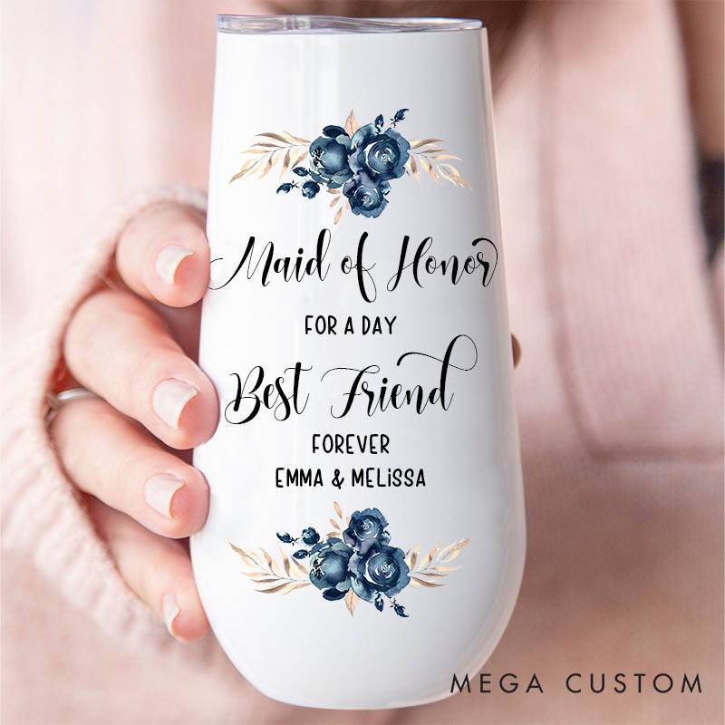 Celebrate special wedding moments with this champagne tumbler featuring "Maid of Honor for a Day, Best Friend Forever" and elegant blue florals. A perfect gift for bridesmaids, it’s a timeless keepsake for weddings or bridal showers.