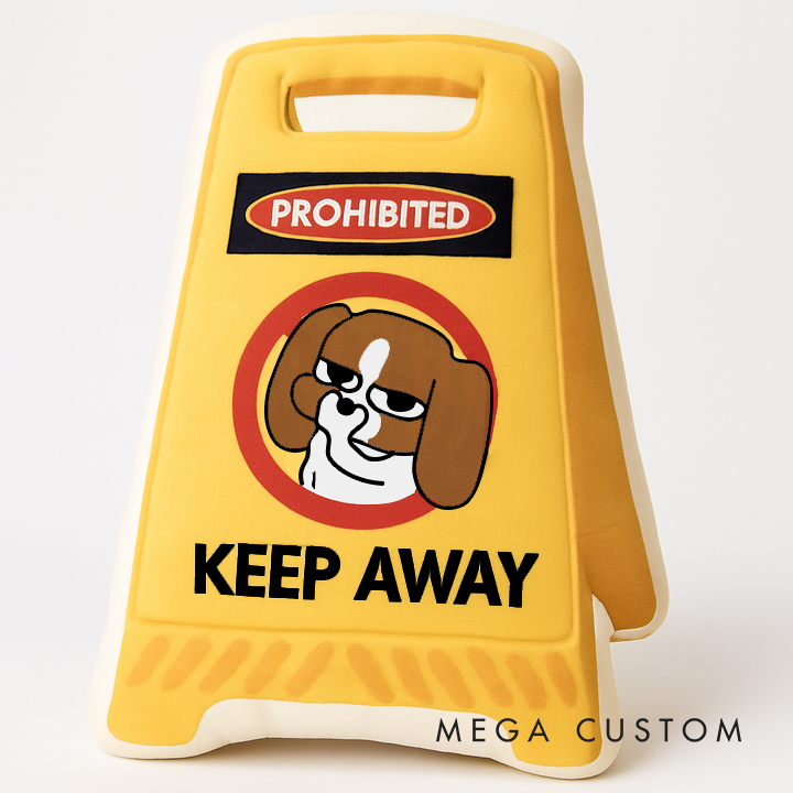 This is a throw pillow designed with a yellow warning sign theme, its shape and pattern mimicking the common "slippery floor" warning sign. The front of the pillow features customizable text and a cartoon-style dog head with a humorous expression, adding a lighthearted touch. The overall design is creative and fun, making it a practical and unique decorative item, perfect as a personalized gift or a fun choice for home décor.