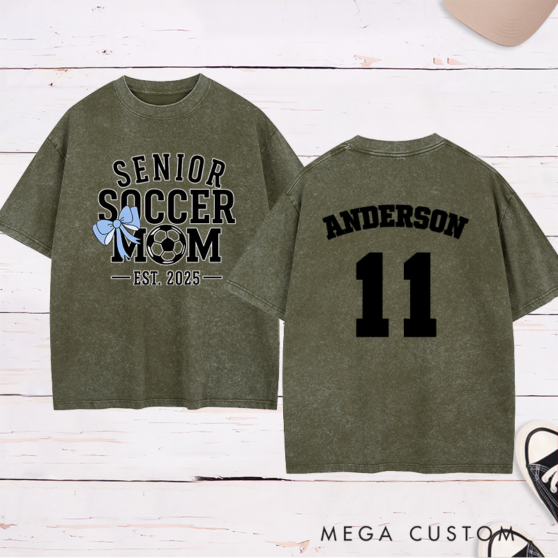 Personalized Senior Soccer Washed Mom T-Shirt with Custom Name, Number, and Graduation Year