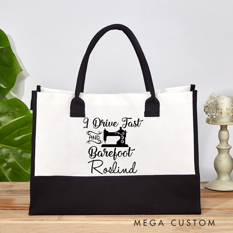 This features the playful phrase "I Drive Fast and Barefoot" in bold black text, paired with a simple illustration of a sewing machine. A fun and quirky design perfect for sewing enthusiasts who embrace their love for stitching with a touch of humor.