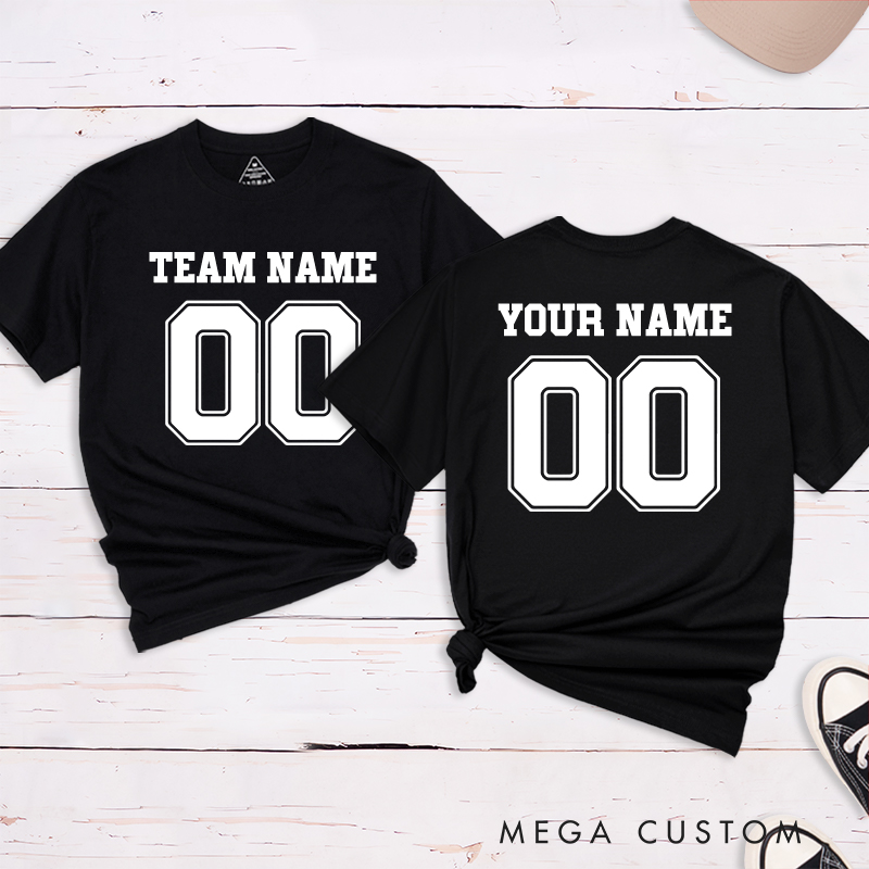 Unite your squad with these personalized T-shirts featuring your team name and player number! Whether you're cheering from the sidelines, playing on the field, or gathering for a team event, these shirts are the perfect way to represent your pride and unity. Customize with your unique team name and favorite number to make it truly yours. Comfortable, stylish, and full of team spirit—gear up and stand out!