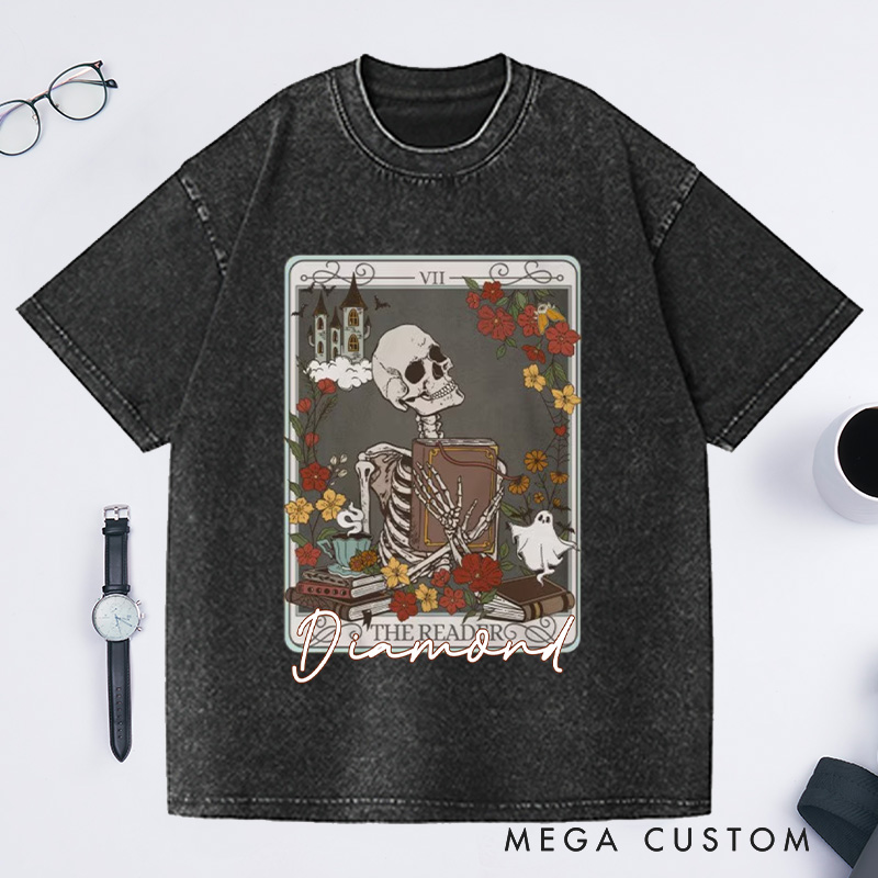 This tarot-style design, titled "THE READER," features a skeleton holding a book, surrounded by flowers, books, ghosts, and castles, creating a mysterious, retro vibe. The skeleton symbolizes an eternal passion for reading, while the flowers and decorations contrast life and fantasy. Artistic and meaningful, this design is perfect for fans of dark aesthetics and literary themes.