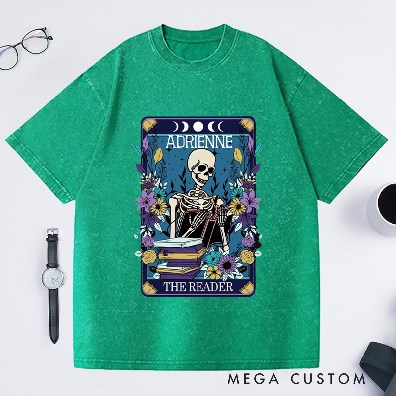 This "THE READER" design features a skeleton holding a book, blending mystery and literature. A dark blue background with moon phases and stars adds fantasy, while purple, yellow, and blue flowers contrast life and death. Stacked books symbolize the power of reading and knowledge. Unique and artistic, it's perfect for fans of reading and fantasy aesthetics.