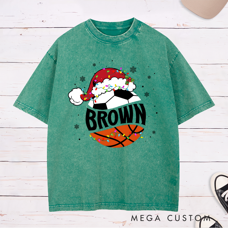 This personalized washed T-shirt is a perfect blend of holiday festivity and sports enthusiasm! Featuring a unique design with a basketball, soccer ball, Santa hat, and colorful string lights, it can be customized with your name for a personal touch. The washed fabric gives it a trendy, vintage look while ensuring softness and comfort for all-day wear. Ideal for holiday gatherings, sports events, or as a thoughtful Christmas gift for basketball and soccer fans. Celebrate the season in sporty style!